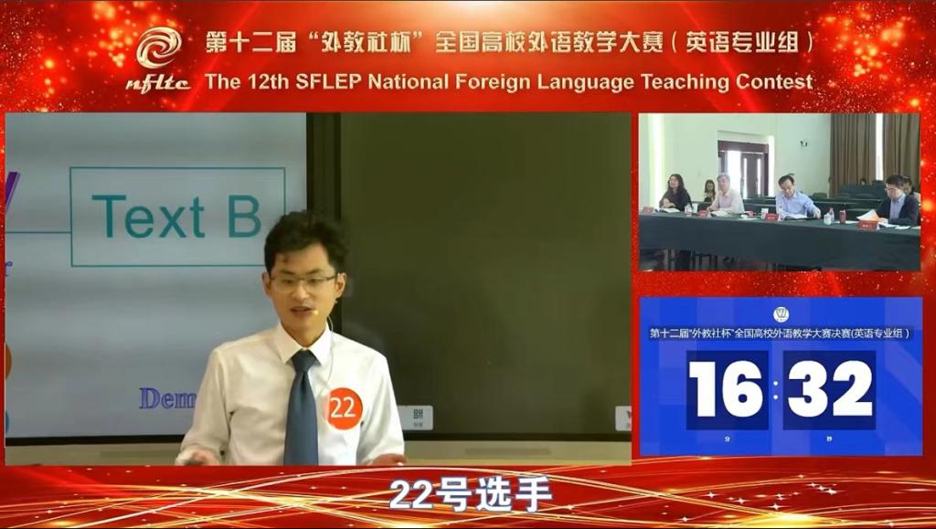 2022年9月23-25日,第十二届“外教社杯”全国高校外语教学大赛全国总决赛圆满落幕。经过三天的激烈角逐,湖南师范大学外国语学院英语系青年教师杨雨箫博士荣获英语专业组全国一等奖的第一名。此次比赛由上海外国语大学主办,上海外语教育出版社承办,线上收看人数达十万。该项赛事是我国最早举办、影响力最大的全国性外语类教学大赛。全国赛分为决赛与总决赛两个阶段,英语专业组参赛选手共计30名,均为各省冠军获得者。决赛阶...