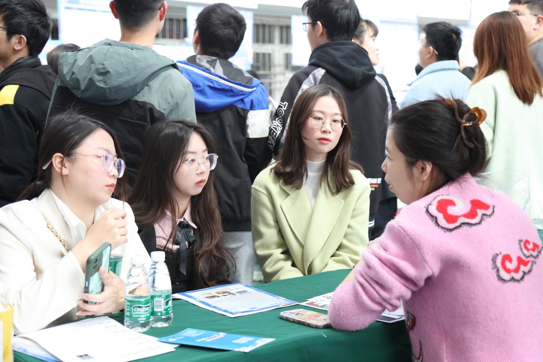 各招聘展位前咨询的学生络绎不绝,用人单位通过海报展板、宣传单以及面对面交流等方式向毕业生介绍单位情况,现场工作人员热情地为前来求职的学生解答问题,双方交流十分融洽。各学院就业专干陪伴并悉心指导毕业生选择就业岗位、投递求职简历,积极对接用人单位并推荐优秀毕业生,切实助力毕业生更高质量就业。