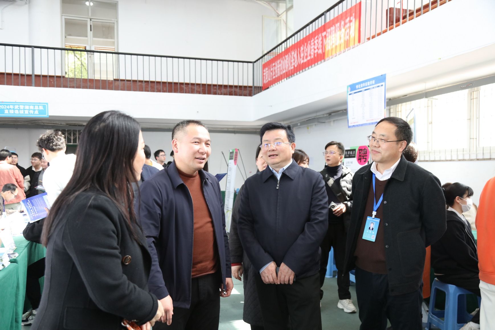 冷志明来到招聘会现场,与参会单位代表和毕业生亲切交流,听取用人单位对吉首大学人才培养、就业工作的意见建议以及对学校组织举办招聘活动的满意情况,并询问毕业生的就业意向与求职进展。