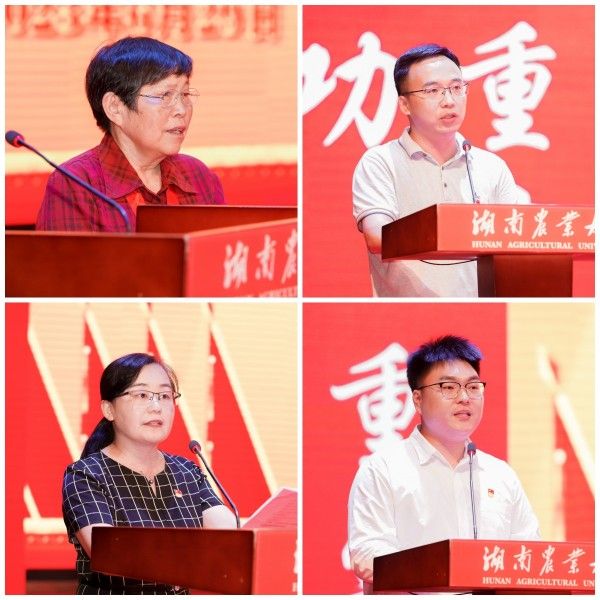 “光荣在党50年”纪念章获得者、全国首届教书育人楷模、党的十八大代表、园艺学院退休教授石雪晖;先进党支部代表,机电工程学院教师第一党支部书记刘大为;优秀教职工党员代表、农学院教授张志飞;优秀学生党员代表,湖南省优秀大学生党员、公共管理与法学学院博士研究生丁海峰分别发言。