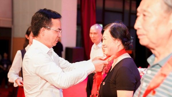 党委委员、副校长吴波宣读获得“光荣在党50年”纪念章的老党员名单,陈弘为获得“光荣在党50年”纪念章的老党员颁发纪念章。