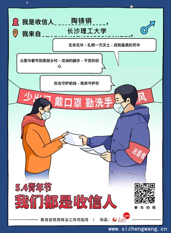 “03年非典被保护的很好的孩子们长大了,在这场疫情防控的人民战争中,成长起来的当代中国青年没有“一代不如一代”,也没有“垮掉”,而是心中有热,眼里有光,用自己的责任、担当和无私奉献,赢得了掌声。新时代的中国青年一定会继续继承和发扬五四精神,从胜利走向胜利,在实现中华民族伟大复兴中国梦的新长征路上奋勇搏击。”长沙理工大学化学学院辅导员兰贵辉说。