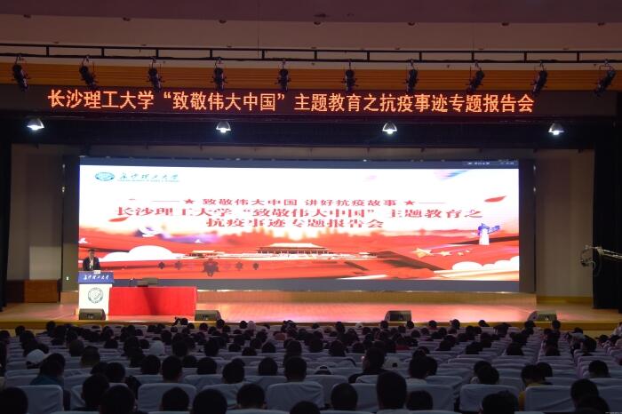 为讲好抗疫故事,上好铸魂育人重要一课,深入推动我校“致敬伟大中国”思想政治主题教育活动,10月7日上午,长沙理工大学“致敬伟大中国”主题教育之抗疫事迹专题报告会在金盆岭校区五教大礼堂隆重举行,全校3万多名师生通过线上直播的方式在各分会场同步收看。长沙市天心区新开铺街道桥头社区党总支书记、居委会主任康姣,中南大学湘雅医院重症医学科主治医师赵春光,中南大学湘雅医院心脏大血管外科ICU护士长张磊,中建五局安装公司华中公司副总经理刘斌四位参加抗击新冠肺炎疫情的“战士”讲述了自己在抗击新冠肺炎疫情中的先进事迹。