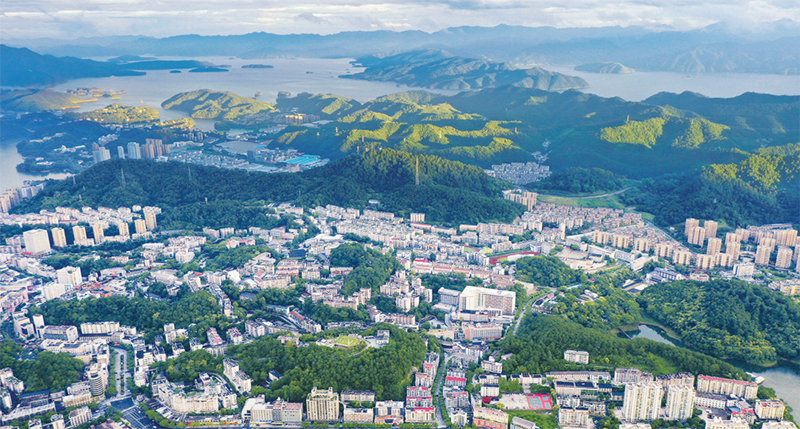 加强生态文明建设,是贯彻新发展理念、推动经济社会高质量发展的必然要求,也是人民群众追求高品质生活的共识和呼声。浙江省杭州市淳安县深入贯彻落实习近平生态文明思想,积极推动绿色发展,努力将绿水青山就是金山银山理念转化为现实图景。图为2022年6月23日,沐浴在金色霞光中的淳安县千岛湖。 求是图片 汪建林/摄